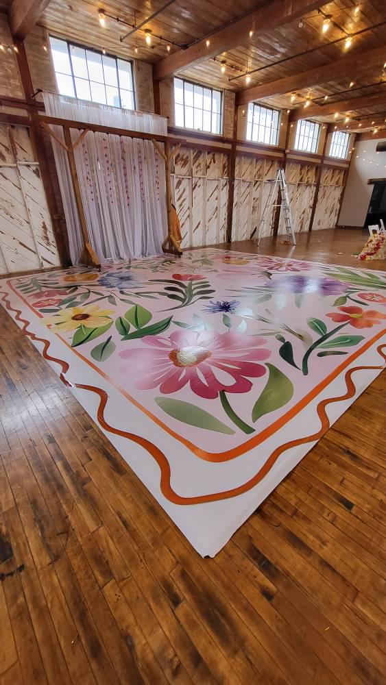 This is a custom dance floor wrap with a glossy or matte finish, very easy to apply and remove. Monogram can be printed or any custom designs to cover the whole floor. We can do any size required. Also, we can design with wedding dates, initials or logos.